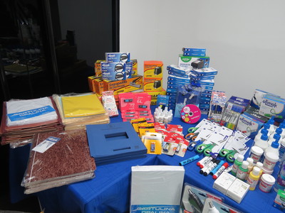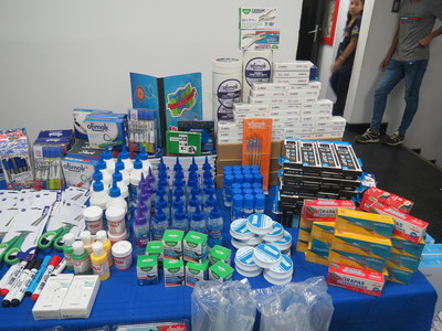 Entre los materiales adquiridos se encuentran: 50 barras para pistola de silicón grande, 700 bolígrafos negros, 13 carpetas para expediente, 200 carpetas manila tamaño oficio, 50 carpetas marrones tamaño oficio, 7 cartulinas azules de 220 g (tipo oficio), 5 cartulinas escolares, 30 cartulinas opalinas tamaño carta amarillas, 30 azules y 160 blancas, 20 metros de cinta de regalo, 30 cintas de doble faz, y cajas de clips mariposa en sus variantes n.º 1 (8 cajas), n.º 2 (35 unidades) y n.º 3 (8 cajas), 12 correctores líquidos, 20 lápices correctores, 15 envases de pega blanca de 250 ml, 21 pegamentos en barra de 40 g y 30 envases de silicón líquido de 100 ml, 14 unidades de cuenta fácil, 50 dispositivos para carnet (yoyo) con sus respectivos 50 portacarnets, 5 engrapadoras estándar, 4 engrapadoras semi-industriales, 3 guillotinas, 5 perforadoras de un hueco, 10 sacagrapas, 3 sacapuntas eléctricos, 20 sacapuntas pequeños, 10 láminas de foami escarchado tamaño carta y 10 doble carta, 800 globos metalizados, 800 globos normales, 20 gomas de borrar, 20 cajas de grapas corrugadas, 150 grapas lisas, 600 lápices de grafito n.º 2, 12 lápices bicolor, 30 libretas empastadas, marcadores puntas gruesas (19 azules, 44 negros, 18 rojos), acrílicos (15 negros, 15 rojos, 20 verdes), puntas finas (30 azules, 30 rojos), resaltadores de texto (20 amarillos, 50 azules, 20 naranjas, 20 verdes), 100 resmas de papel base 20 tamaño carta, 10 resmas tamaño extra oficio, 20 metros de papel celofán, 10 rollos de papel contact transparente, 20 pendrives, baterías (10 de 9 V, 10 AA, 10 AAA), 5 pinceles, 3 pistolas de silicón grande, 10 tijeras de 7.25 pulgadas y 10 pinturas al frío.